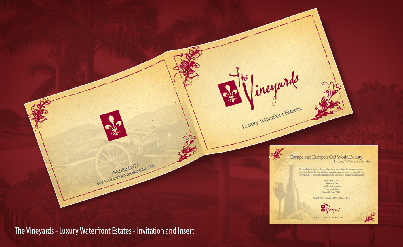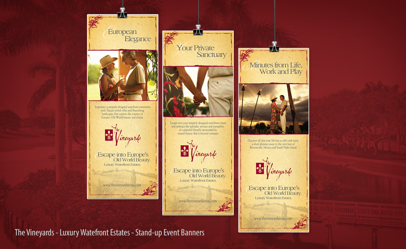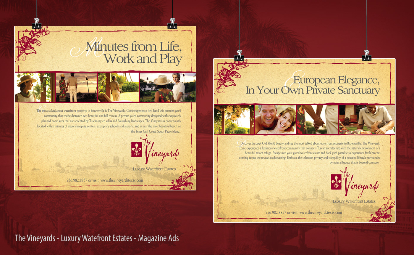 The Vineyards - Luxury Waterfront Estates task was to create the developers vision for high end property real-estate sales. We created the logo, advertisements, collateral, promotional materials, and banners.